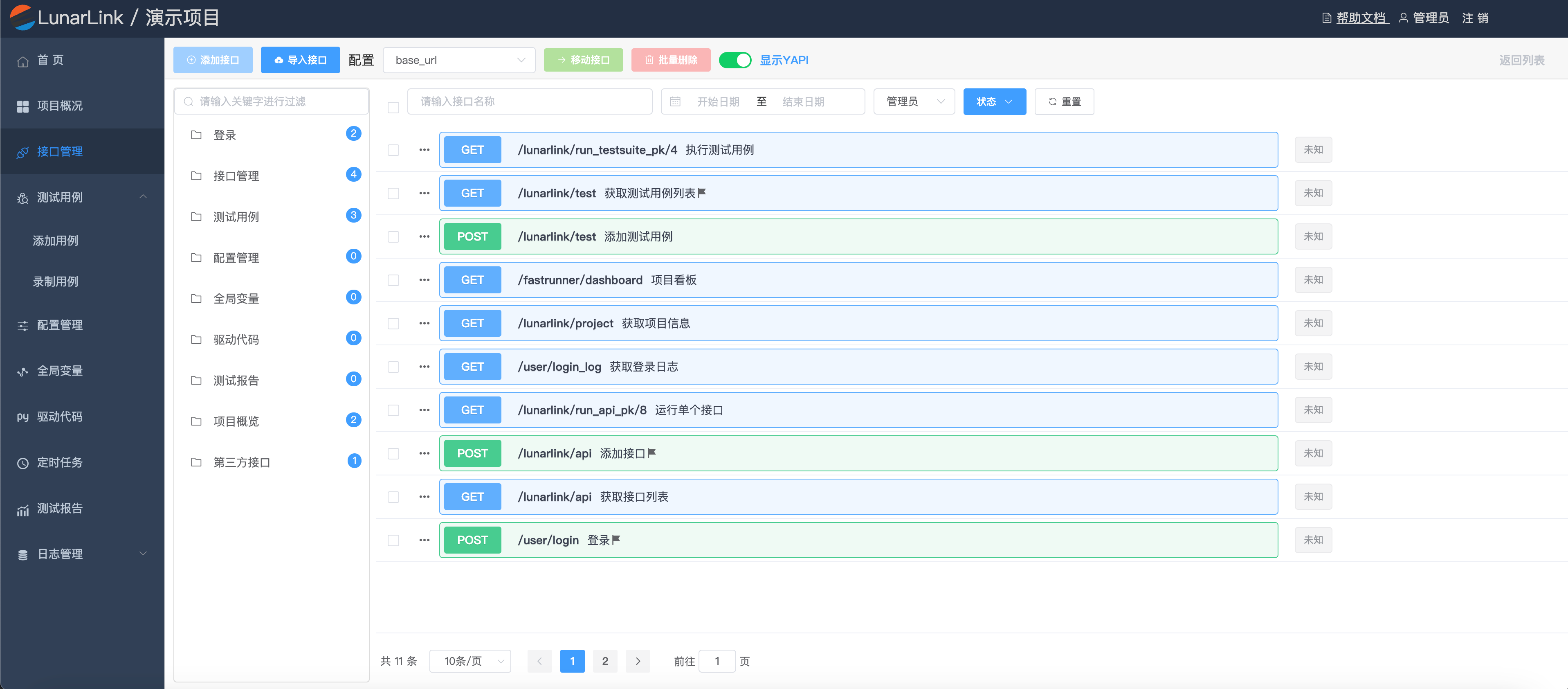- 项目概览:项目基本信息,API、测试用例、任务执行总览,每日明细